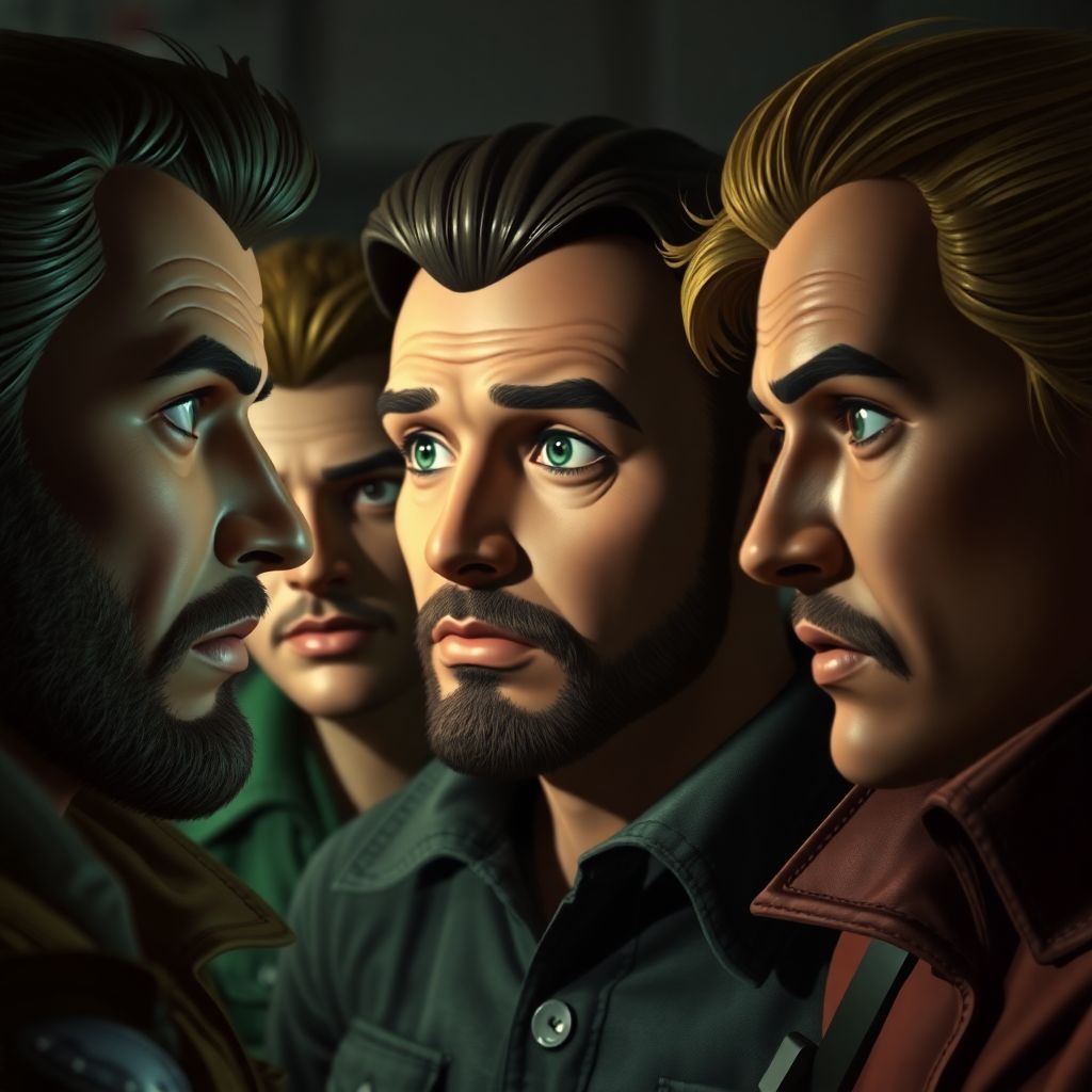 Стилистика ретро-Fallout чувствуется и в деталях. Линии лица слегка утрированы, тени нарочито контрастные, а кожа персонажей будто подсвечена зелёным или жёлтым светом, напоминающим свечение Пип-Боя или старых люминесцентных ламп. Металлические элементы брони и оружия прорисованы грубо, с подчёркнутыми царапинами и ржавчиной - так, как это часто делали художники конца 90‑х, когда реализм уступал место выразительности.