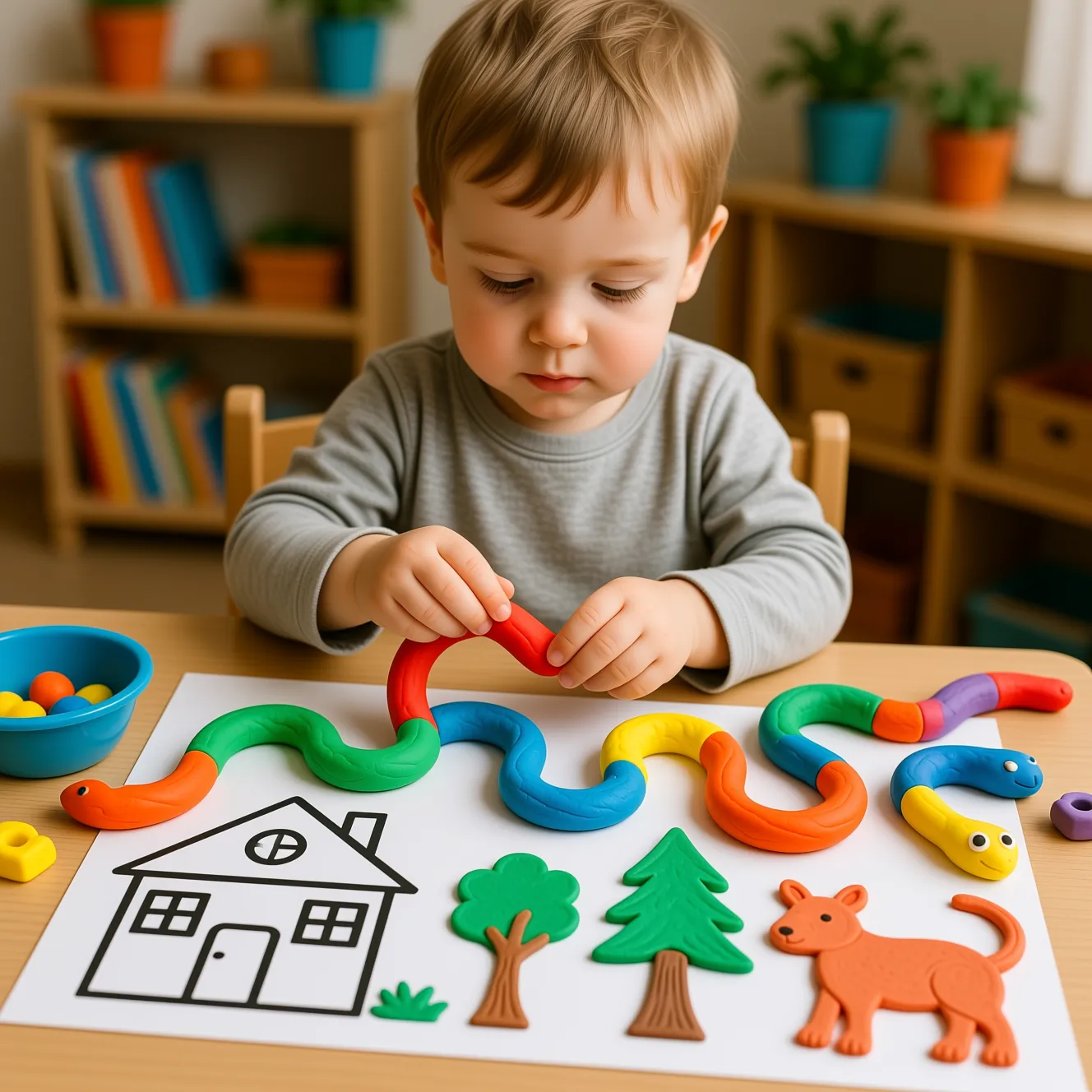 Пластилиновые коврики (playdough mats) - это простые на вид, но очень эффективные развивающие материалы: обычные листы с контурами фигур, предметов, букв или цифр, по которым ребёнок выкладывает тонкие жгутики или шарики из пластилина. Во время такой работы тренируется точность движений пальцев, сила нажатия, координация глаз и рук, а заодно формируется база для аккуратного письма и рисования. Особенно удобно, что пластилиновые коврики можно распечатать дома или в копицентре и практически сразу приступать к занятию, не тратя время на долгую подготовку.
