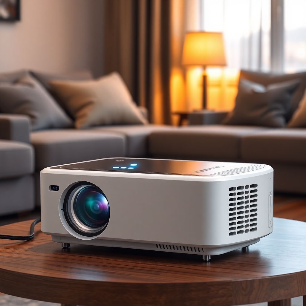 Корпус проектора выполнен преимущественно из пластика молочно‑белого цвета с матовой поверхностью, не собирающей отпечатки пальцев и бликов. Верх закрыт прозрачной пластиковой пластиной с серебристой подложкой — это придаёт устройству более «домашний», аккуратный внешний вид, позволяя ему органично вписаться в интерьер гостиной или спальни.